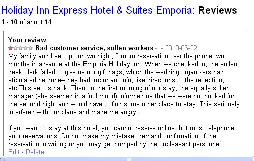 This 21st century truth was brought home to me when, after having a bad experience with a Holiday Inn, I sought out the corporate owners so that I might send a complaint letter. This is what we were doing in the 20th century, of course–letting the owners know what was wrong so they could take corrective action. But as I was seeking out the info I needed using the google search engine, I found that right alongside the information was a button saying “write a review.” I couldn’t resist. It was so easy, and prepared my statement for the bosses, who are still getting the complain letter. The only difference is that now everyone knows of my critique, and the effect of my communication may go far beyond what it could have in the 20th century.