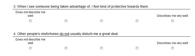 This survey from the University of Michigan–the basis for my speculations in a previous post–is designed to measure the extent to which you care about other human beings. Questions like these tell us how much you care for your fellow man: