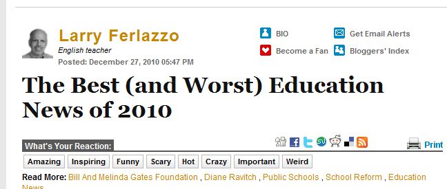 Larry Ferlazzo is an exciting new edu-blogger I’ve found via Twitter. He’s on Huffington Post now, and his end-of-year list (“The best and worst of education news 2010”) is a fine compendium of the crazy year we in public education are almost through with.