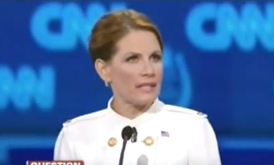 Finally, there was Rep. Michele Bachmann, who was pushed all the way to the edge, away from the men. She was dressed tonight like the captain of an American spacecraft, circa 2050. She did not mix it up with the guys, positioning herself as the cheerleader in chief for the GOP. She mainly spouted “we can do it,” and made broad attacks against the common enemy, Barack Obama. “Go team!” was pretty much her line.