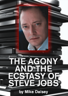 Tonight I enjoyed Berwyn’s 16th Street Theater Company’s rendition of Mike Daisey‘s 2010 play, directed and performed by Lance Baker through February 9. The monologue + Powerpoint, famously “fabulated” by Daisey with less than journalistic rigor, raises important questions for the modern user of technology, but it does so with considerable humor and nuance. The indisputable truths of the show–that Steve Jobs was a difficult genius to work for, that his insistence on mass marketing his Bauhaus-influenced computers led to exploitative global sourcing–are delivered in user-friendly fashion, so that both the long-time Apple user and the casual user of smartphones is equally implicated in the show’s condemnation, yet they can equally enjoy an engaging night of entertainment.