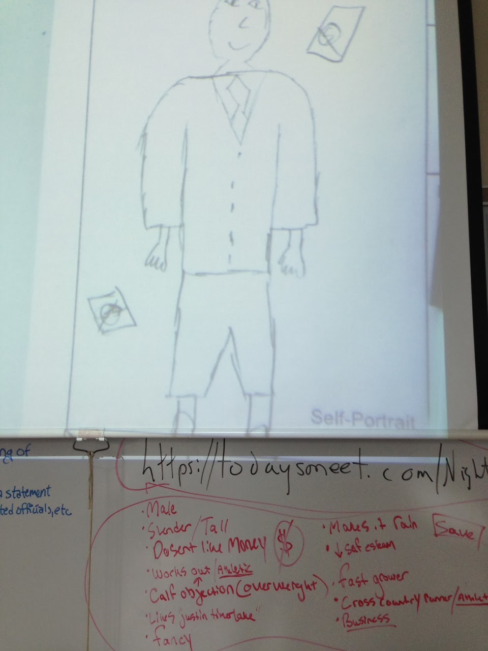 - each student’s self-portrait is displayed anonymously on the screen through the ELMO camera (sometimes it is fun to hyperfocus and force them to experience inferencing with too little, or poorly cropped edited evidence)