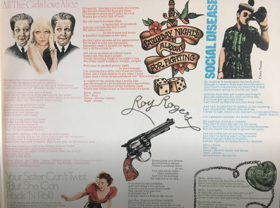 I saved my allowances to buy all of Elton’s records, from 1970’s Tumbleweed Connection to 1973’s Goodbye Yellow Brick Road. And in that time Taupin’s protagonists grew dark with a growing awareness of corruption and human depravity–strong stuff for 12-year-old me. There were “sweet painted ladies,” abused lesbian teenagers, former soldiers down on their luck, and everywhere, the companionship and comfort of alcohol. I learned that it was a good pain reliever and vivifying antidote to suicidal thoughts, and that a “couple of vodka and tonics” could “get you on your feet again.” I also learned that parties began when one got “about as oiled as a diesel train” and with a “belly full of beer” violently claimed possession of a woman.