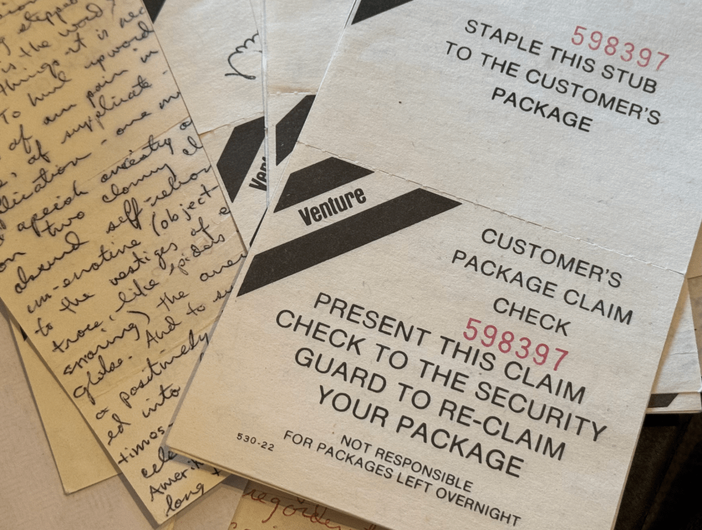 I know all this in 2025 because in 1981 as I manned my Venture post, I also wrote down my thoughts on the back of those receipts. On one side they read, “STAPLE THIS STUB TO THE CUSTOMER’S PACKAGE.” On the other, they held blank space for my mind’s and heart’s expression.